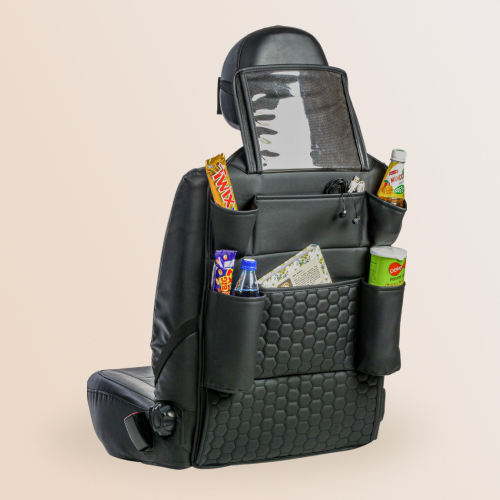 What a great product! This handy seat-back organizer offers ample storage space for all travel necessities like drinks, snacks, books and even a special pocket for tablets which keeps the kids entertained throughout the journey.