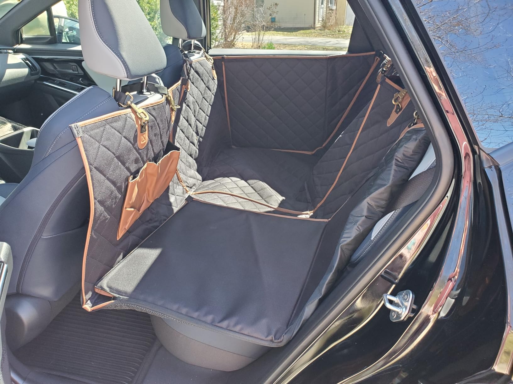 This dog hammock has become an essential for our family road trips! It's easy to install and stays put thanks to seat anchors and sturdy straps. I love how it protects my car seats from spills with its waterproof fabric.