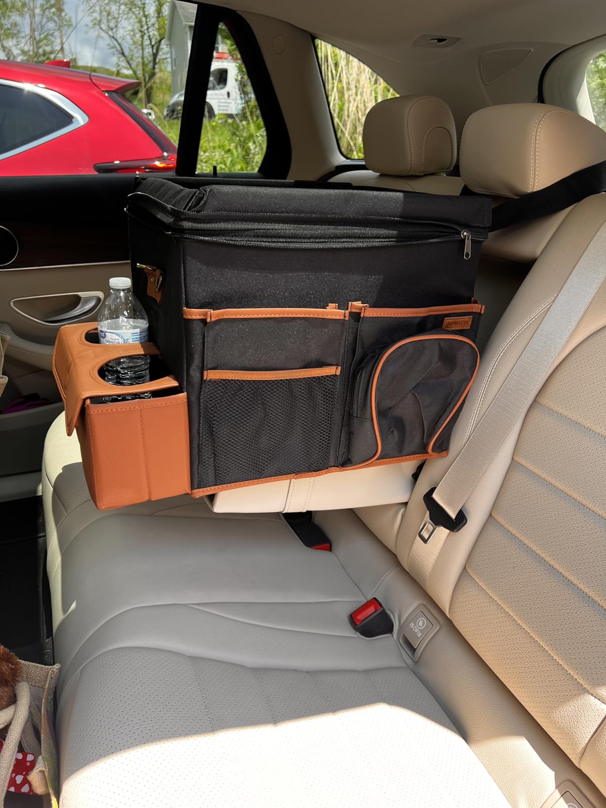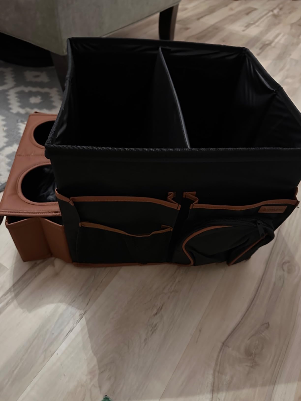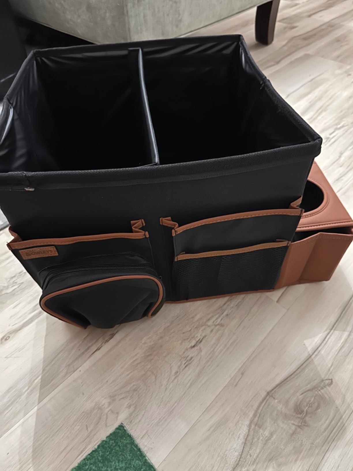 Now this is my favorite car organizer! I received my order a month ago. I purchased this to keep in the back seat with my son. Inside, I stored everything that was lying in my car and didn't have its place. And I use the pockets to store my son's toys, snacks and drinks. So convenient! My son also loves the lid and uses it as a table. High-quality, stylish, and really versatile organizer! Thanks a lot!