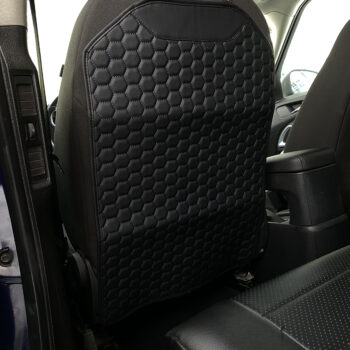 Our seat back protector features a five-layer construction with upgraded premium eco-leather on top, two layers of high-density foam, 600D Oxford, and an anti-slip rubber backing.