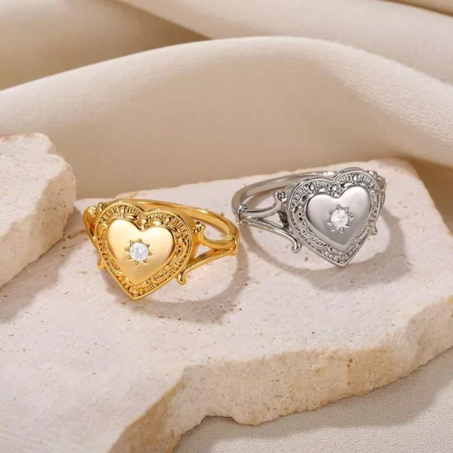 Crafted with precision and care, the ring features a dainty 2MM band made from high-quality stainless steel, ensuring durability and long-lasting shine. The centerpiece, a beautifully engraved heart adorned with crystal accents, sits gracefully on a tension mount setting, offering both style and security. Its cute and romantic style makes it an ideal choice for engagements or as a testament to self-love.