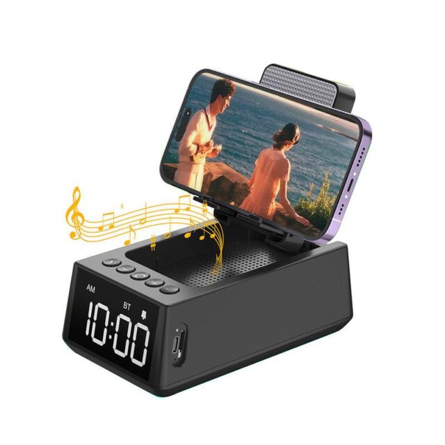 What makes this speaker stand special is its versatility. Whether you need a loud alarm clock to wake up in the morning or a portable speaker to enjoy music throughout the day, this product delivers exceptional performance. Featuring advanced Bluetooth 5.3 technology, it connects seamlessly to your devices and provides crystal-clear sound for all your favorite playlists. Its adjustable phone stand fits a wide range of smartphones and tablets, making it your go-to stand for both work and entertainment.