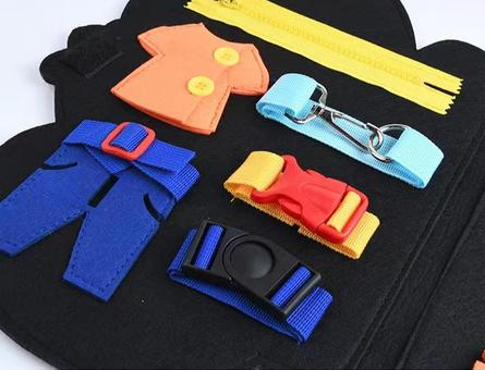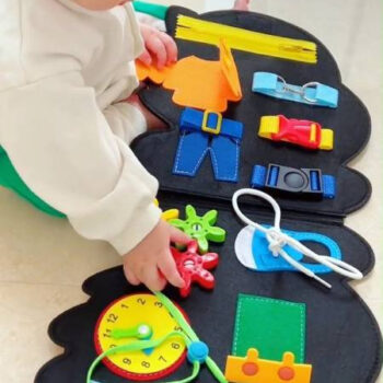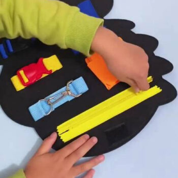 This toy is fantastic in helping children develop fine motor skills and cognitive abilities while having fun at the same time! My two-year-old loves playing with different parts like belts or school bag buttons; even his speech has improved since he started using this tool regularly because he needs to communicate what part he wants help with next!