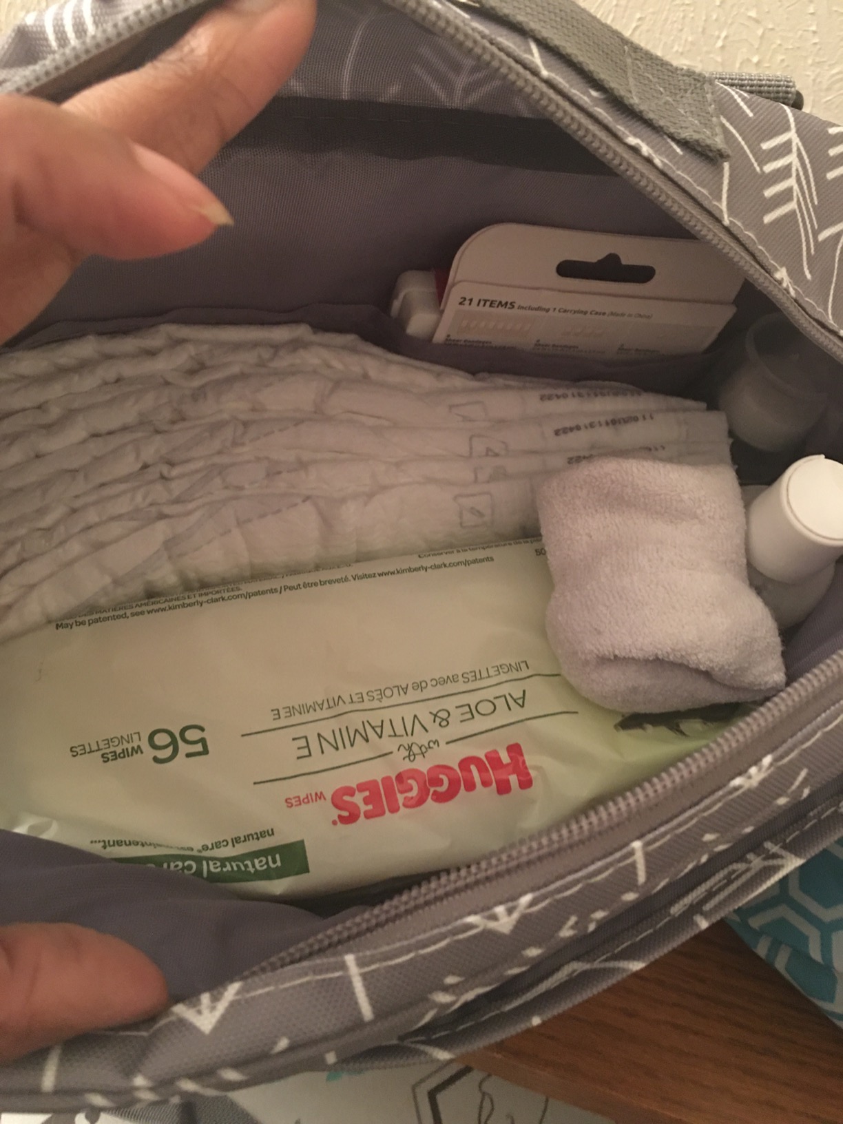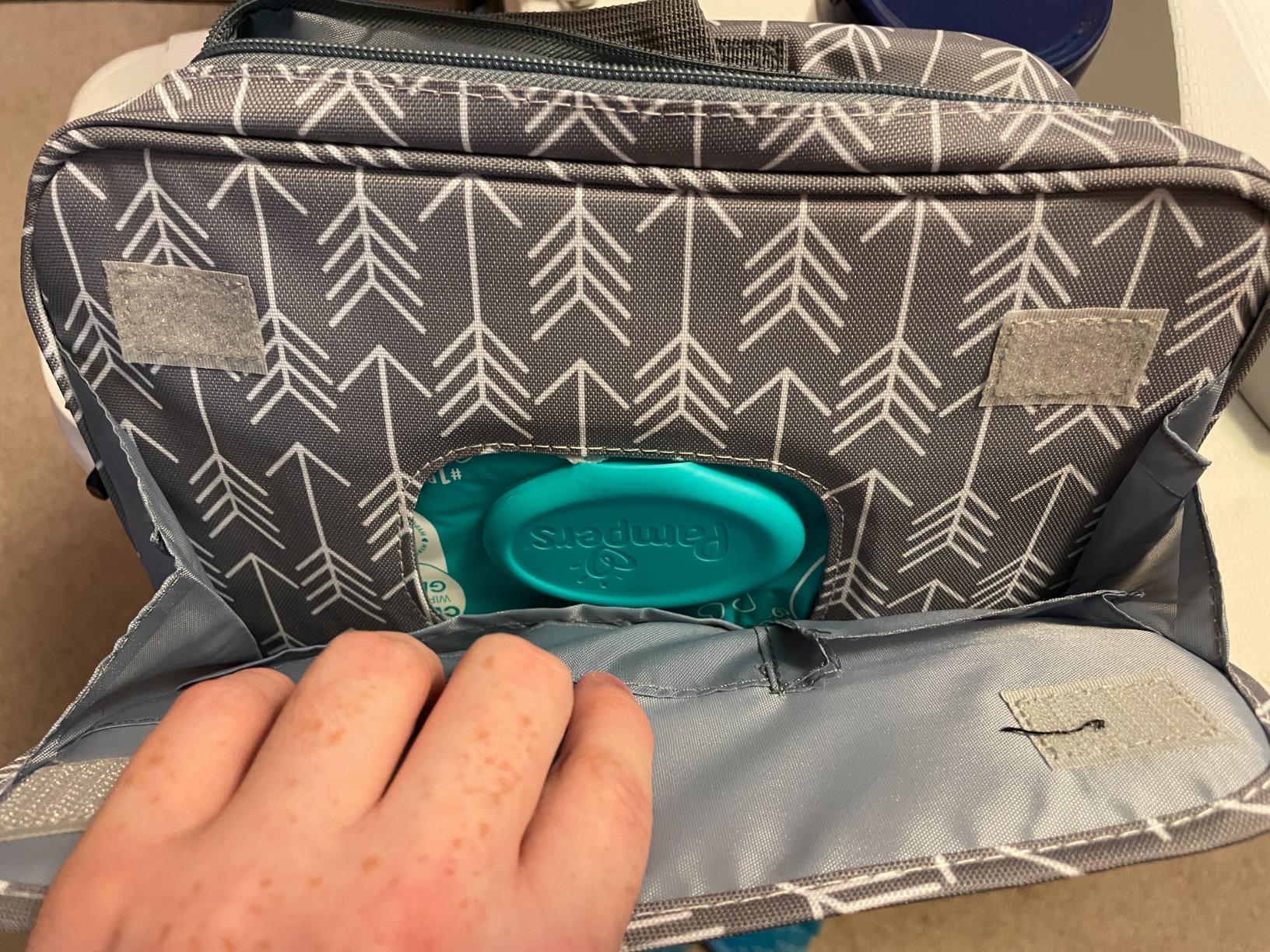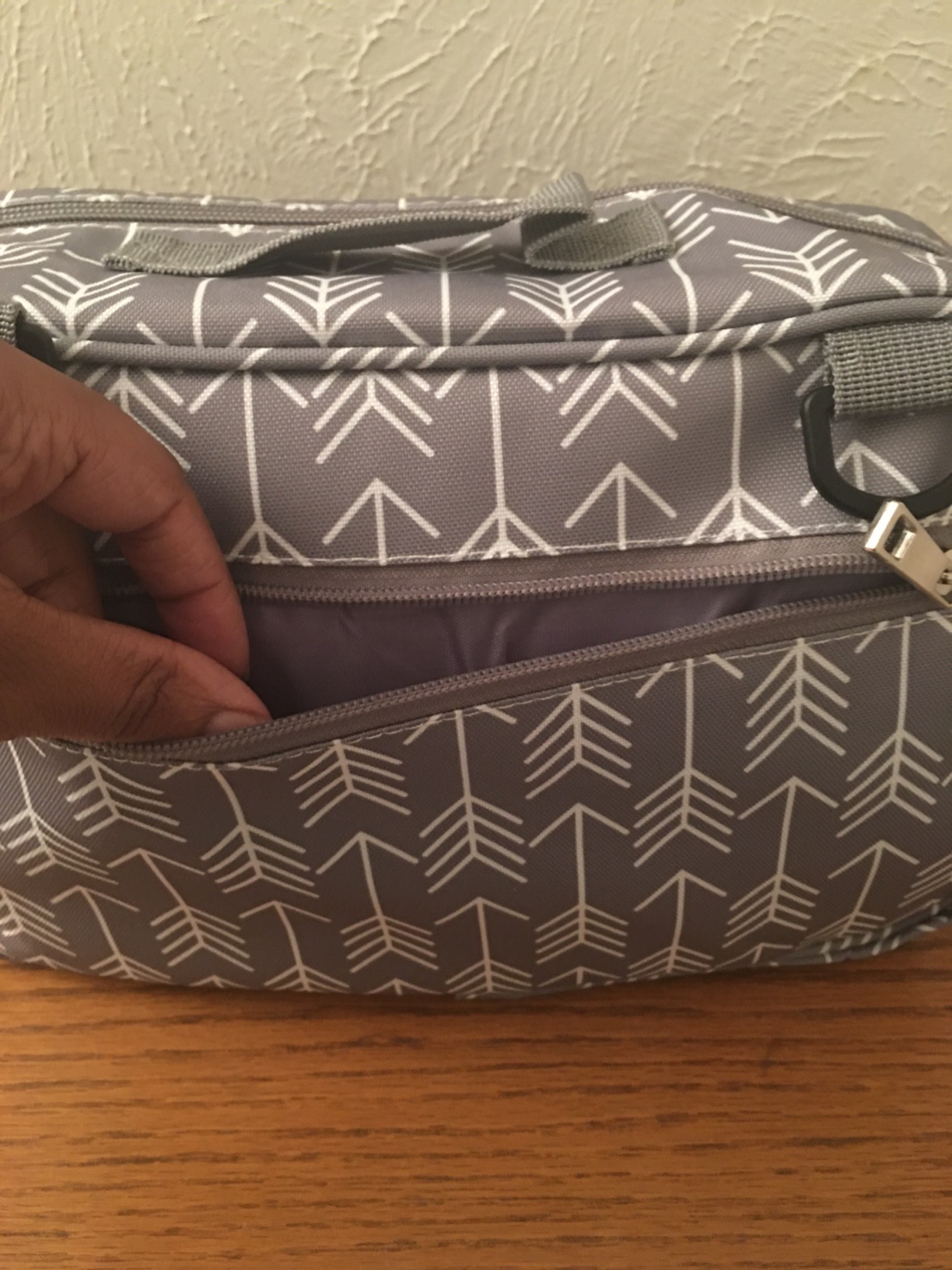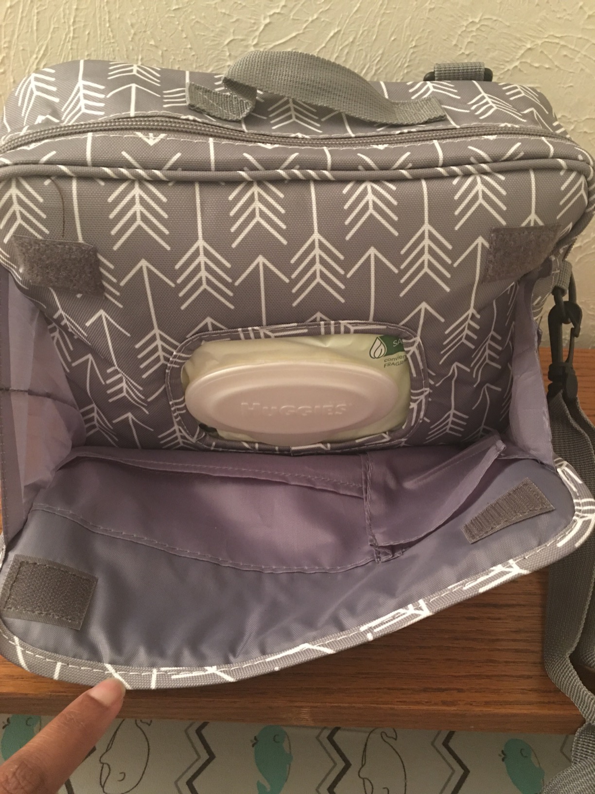 This bag was a great find! Perfect for quick trips where we don’t need much. Comfortably fits a pack of wipes, 4 or 5 diapers, a burp cloth, and a small bottle. Could have added my wallet and phone too.