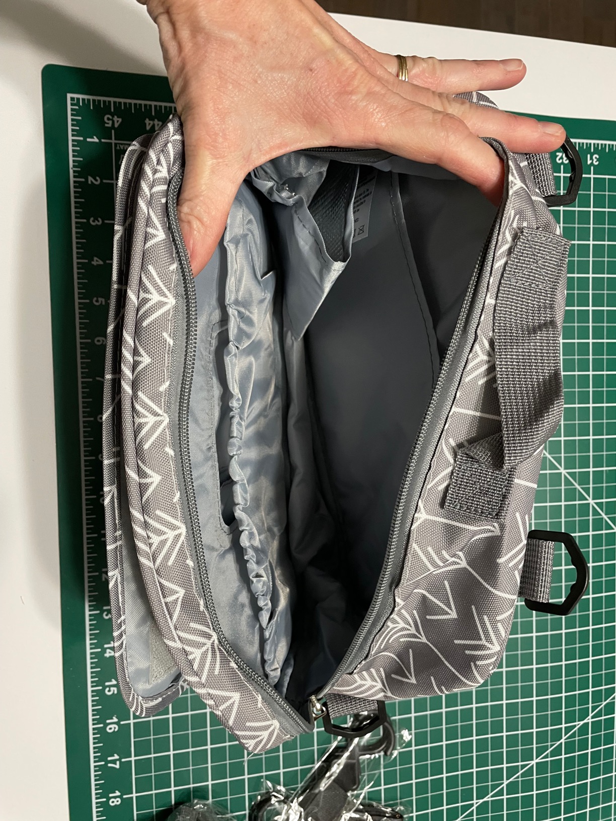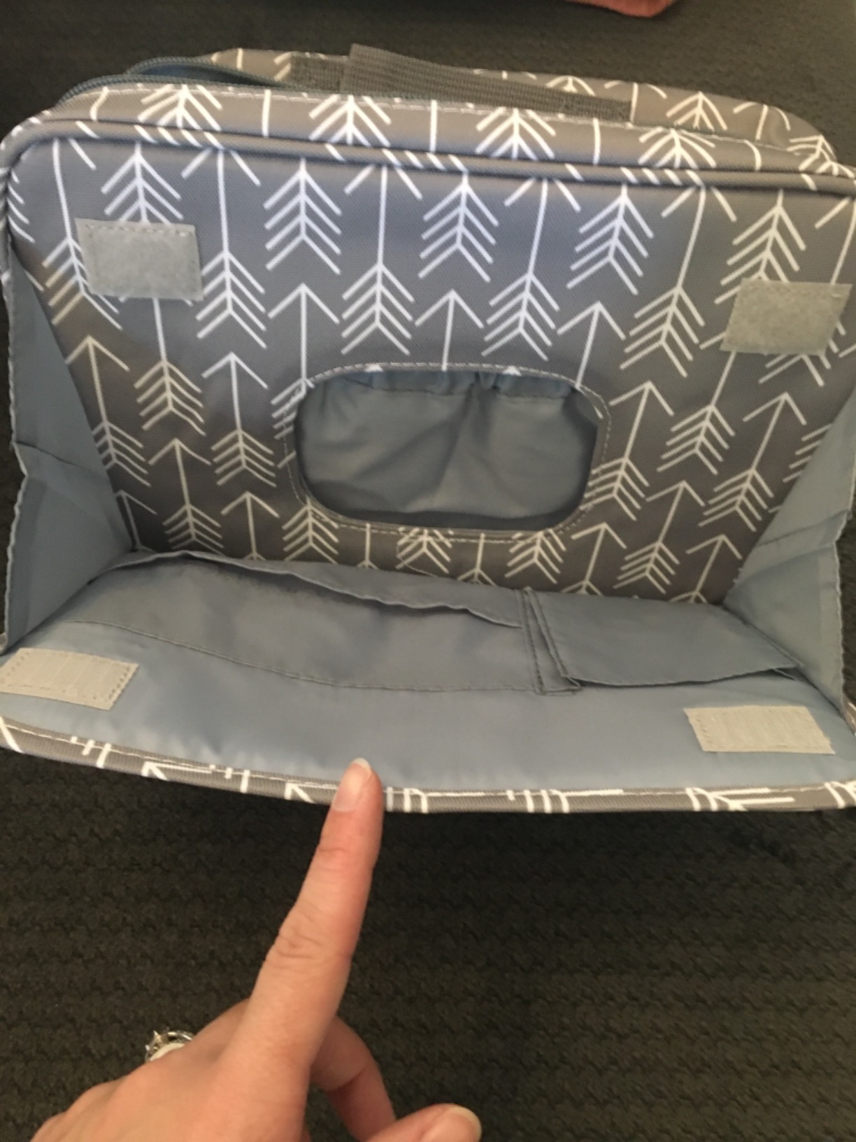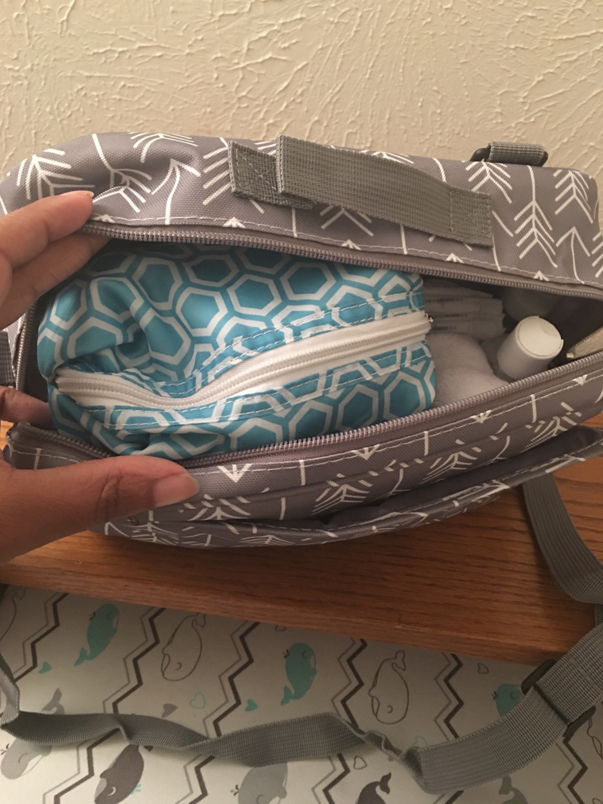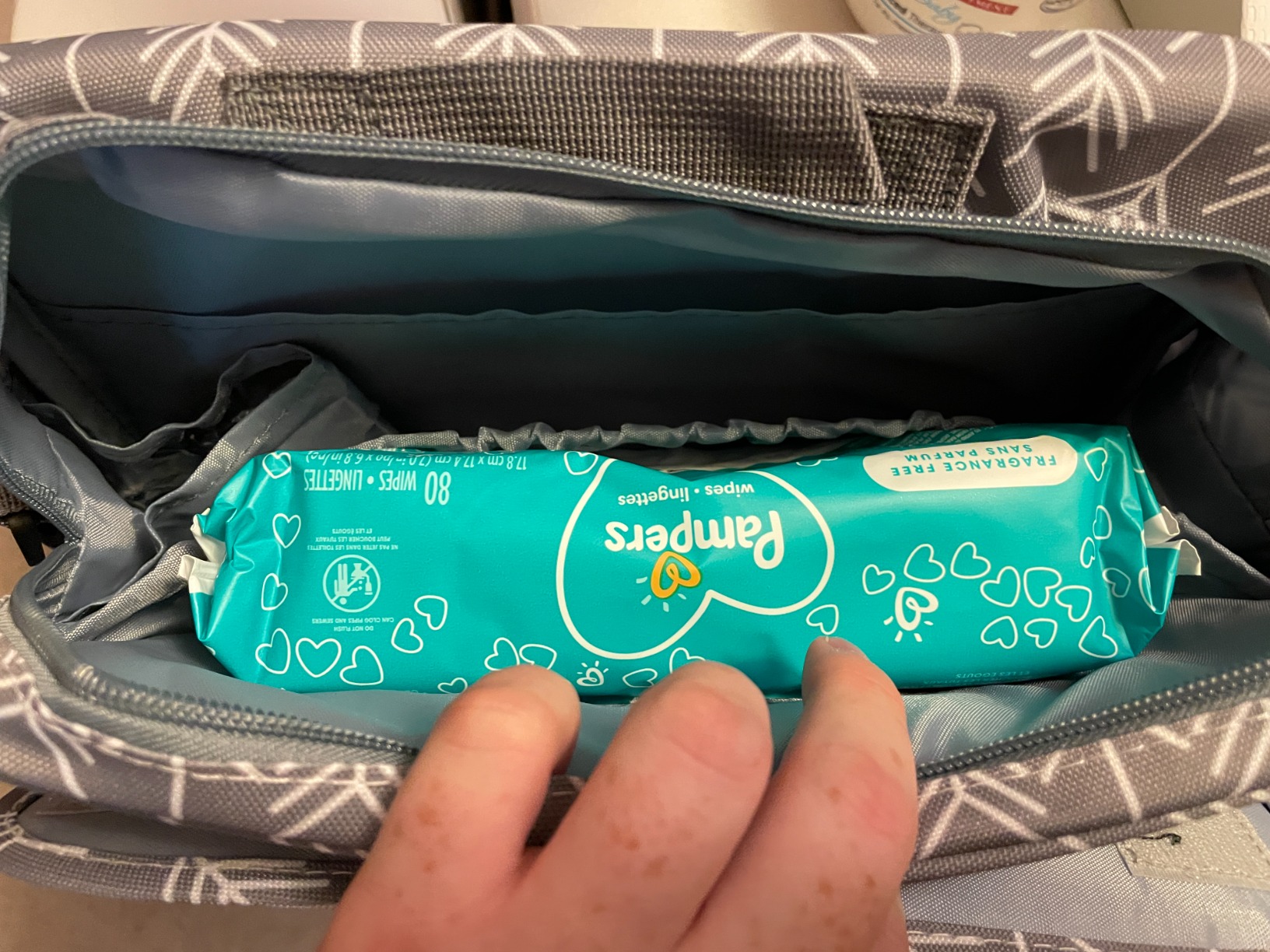 This bag was a great find! Perfect for quick trips where we don’t need much. Comfortably fits a pack of wipes, 4 or 5 diapers, a burp cloth, and a small bottle. Could have added my wallet and phone too.