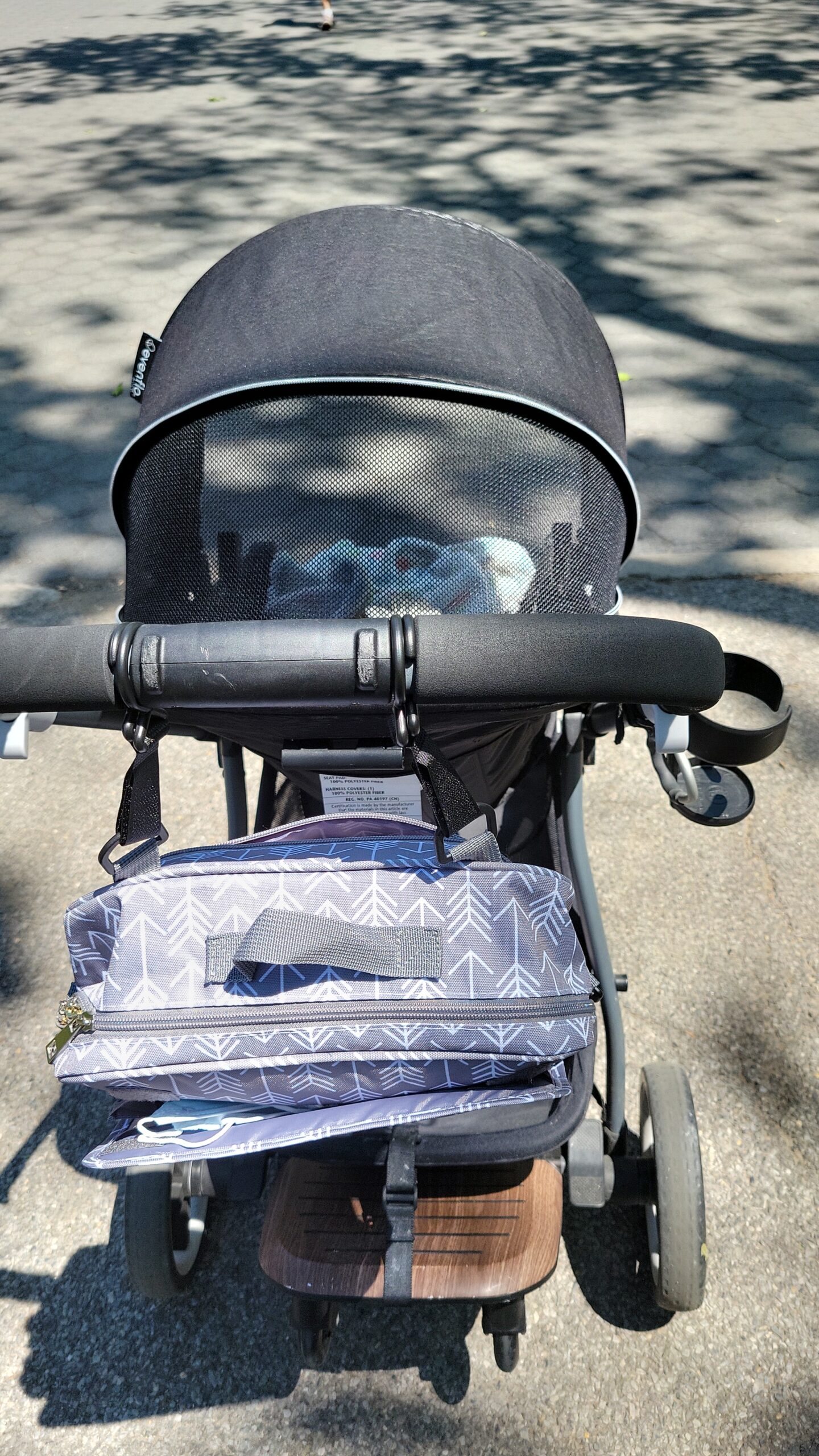 Using it on my travel stroller and it's incredibly convenient. Serves as a purse and baby bag, easy to attach and detach, making my vacation a breeze. So grateful.