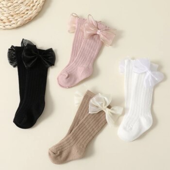 4 Pairs Baby Girls Bow Socks, Mid-Tube, Solid Colors, 0-2 Years
