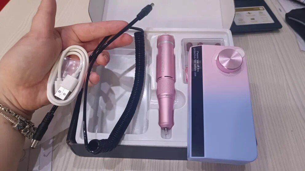 This rechargeable nail drill machine has been a game-changer for my at-home manicures. the drill is lightweight and easy to handle, with intuitive controls and multiple speed settings. the rechargeable battery is a major plus – it lasts a long time and makes the drill very portable and convenient to use anywhere. the attachments are excellent, covering all my nail care needs from shaping to buffing. the drill is powerful enough to handle tough nails yet gentle enough to avoid damaging my natural nails. it’s also very quiet and doesn’t overheat, making it comfortable to use for extended periods. i’ve noticed a significant improvement in the quality of my manicures since i started using this machine. it saves me a lot of time and money compared to regular salon visits. overall, i’m extremely happy with this purchase and highly recommend it to anyone looking for a high-quality nail drill.