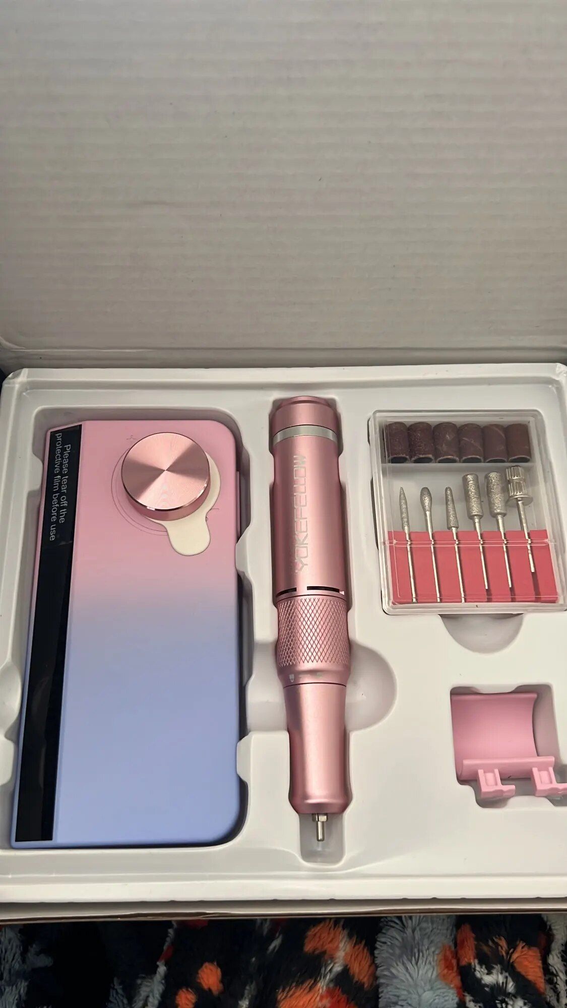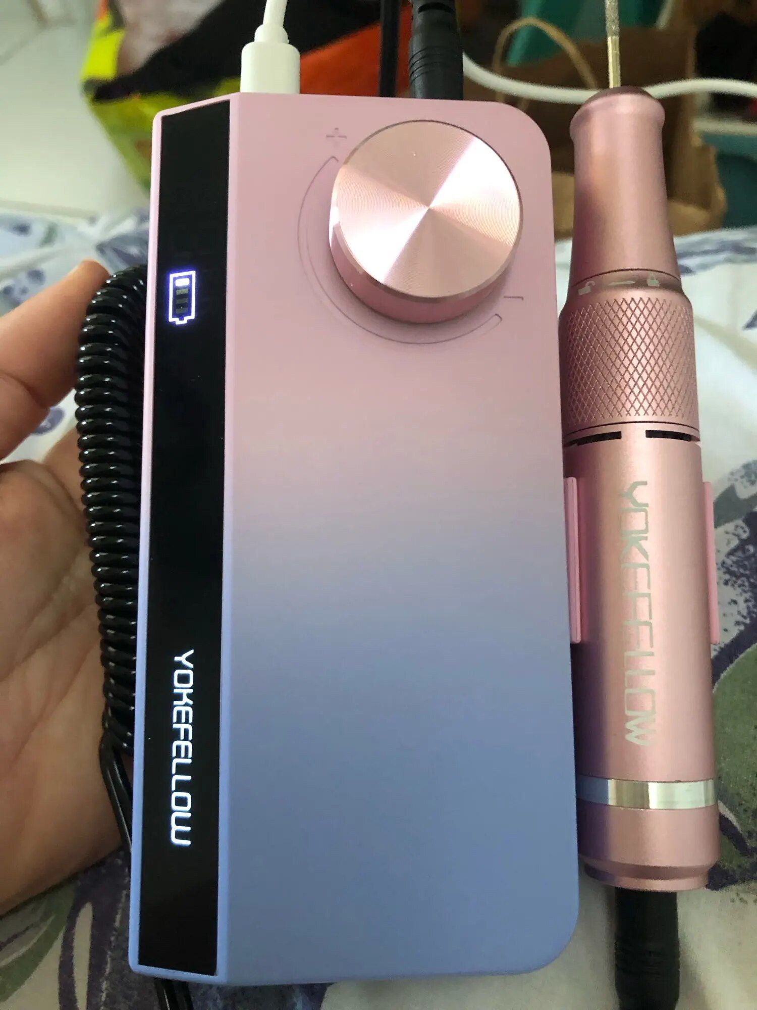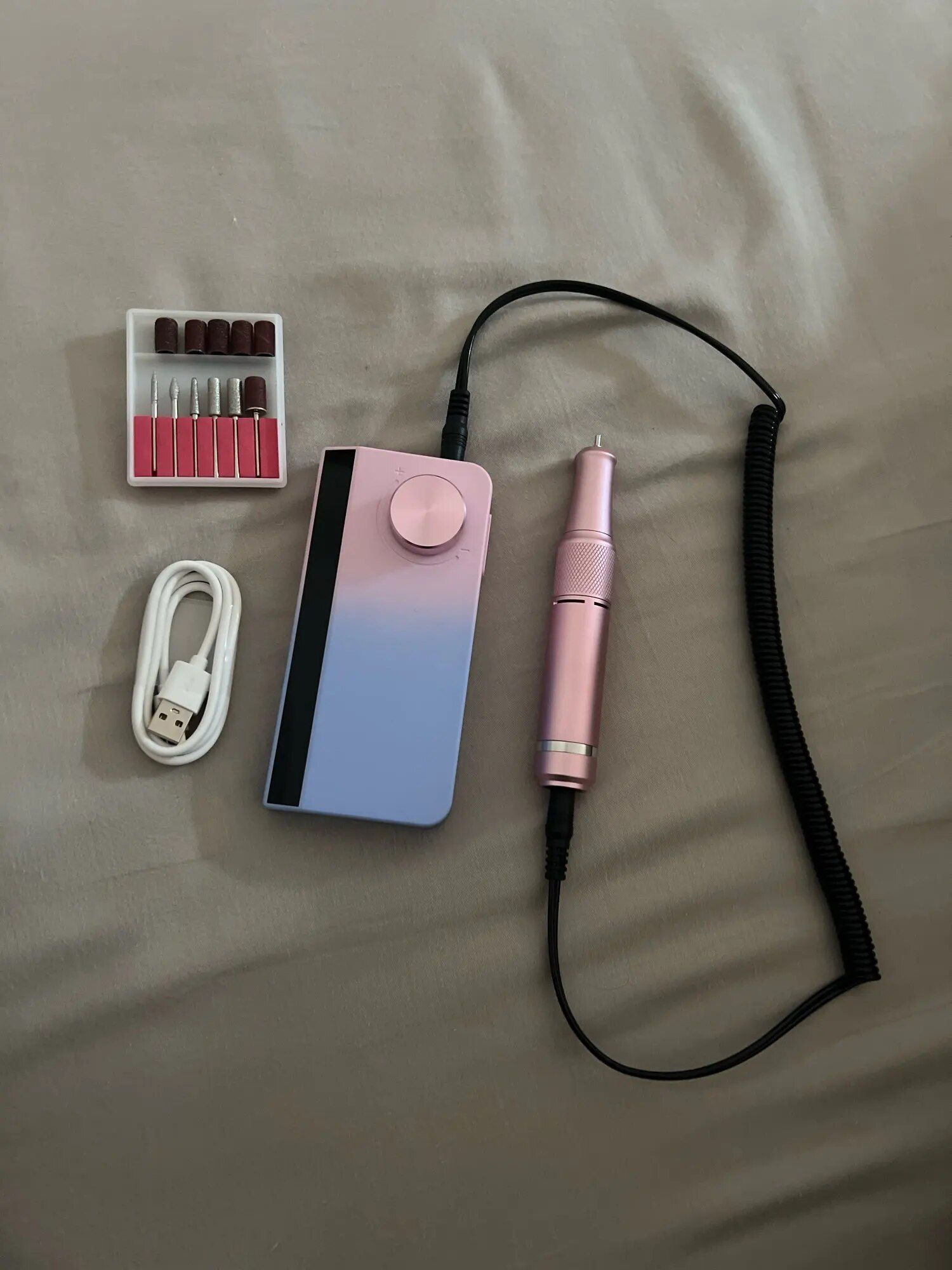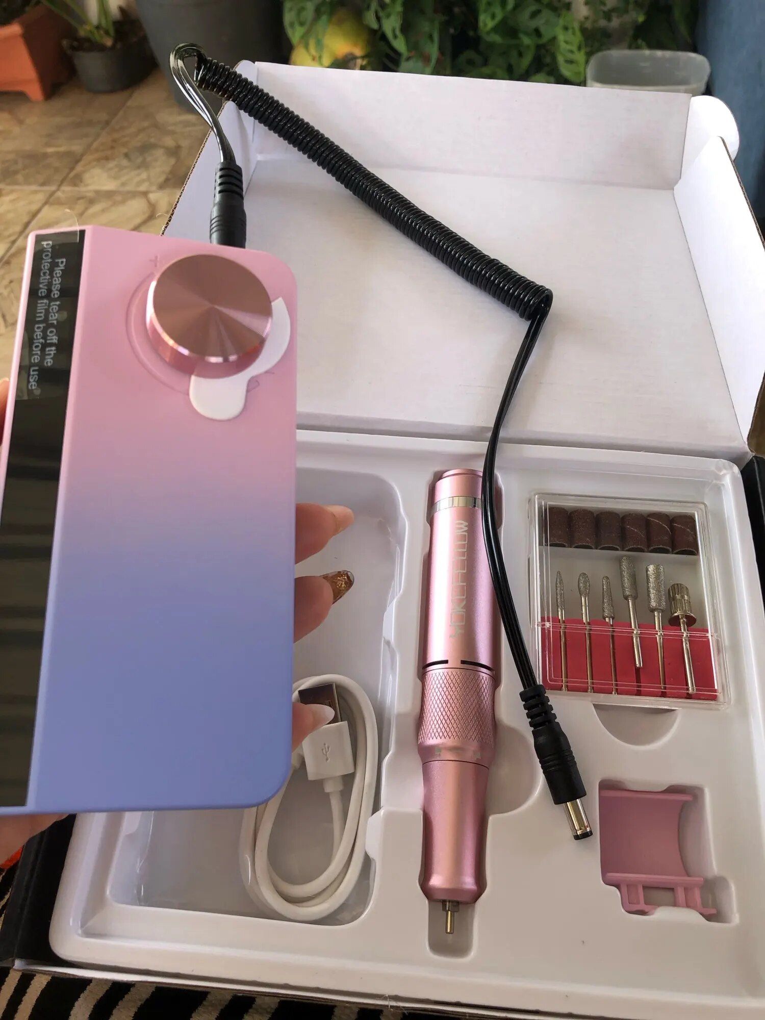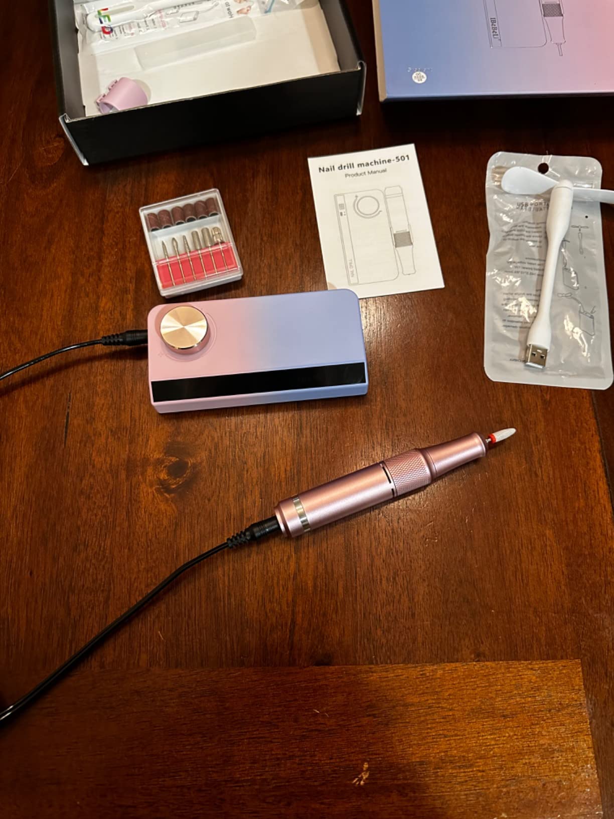 My wife, an avid DIY dip powder manicure enthusiast for nearly two years, has experimented with various drills but finds this one exceptional, especially adoring its unicorn/mermaid color gradient. The package is comprehensive, including a wide range of accessories and the convenience of a rechargeable design. The digital display and memory feature for speed settings enhance its user-friendliness. The included USB fan and flashlight, with their adjustable positions, add to its appeal, making manicure sessions more enjoyable even during our TV time, thanks to the bright and useful flashlight. The fan's strength is impressive for its size, and while the device has a single USB port, limiting simultaneous accessory use, it's a unique feature not found in her other drills. She highly recommends this drill for its distinctive features and overall quality.