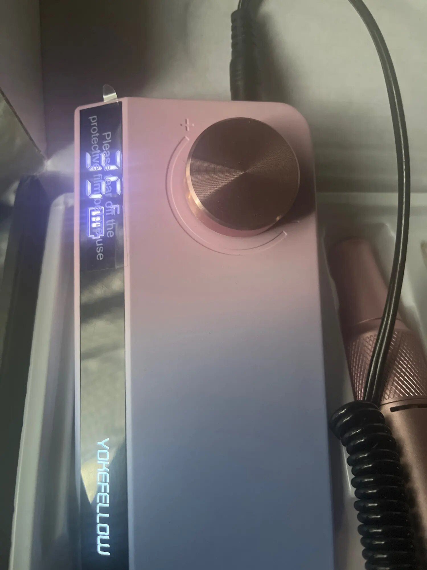 The color scheme of this e-file is captivating. Its portability is a significant advantage, arriving fully charged and ready for immediate use. Starting the device is simple, requiring a press and hold of the dial until the display illuminates, remembering your last speed and direction settings for convenience. It rotates in both directions, making it easy to switch hands. The pause feature and memory function are practical additions. Although it's slightly heavier on the end with the cord, its design, functionality, and included diamond and ceramic bits make it a standout choice. The additional USB port for charging phones or powering the included light and fan is a thoughtful touch, although not essential. Overall, it's a fantastic tool for both beginners and experienced nail artists, offering ease of use and excellent features.