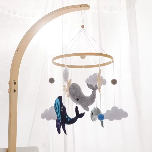 Transform your baby’s nursery into a magical underwater world with this adorable Soft Felt Marine Animals Crib Mobile. Featuring charming, handcrafted cartoon marine creatures like whales and other ocean animals, this mobile will captivate your little one’s attention. With its soothing musical bed bell, soft felt textures, and calming colors, it’s designed to help lull your baby to sleep while stimulating early visual and auditory development. Crafted with a durable wood bracket, it adds a touch of natural elegance to any crib or play area. Perfect for infants aged 0-24 months, this mobile is not just a decoration – it’s an engaging sensory toy for your baby.