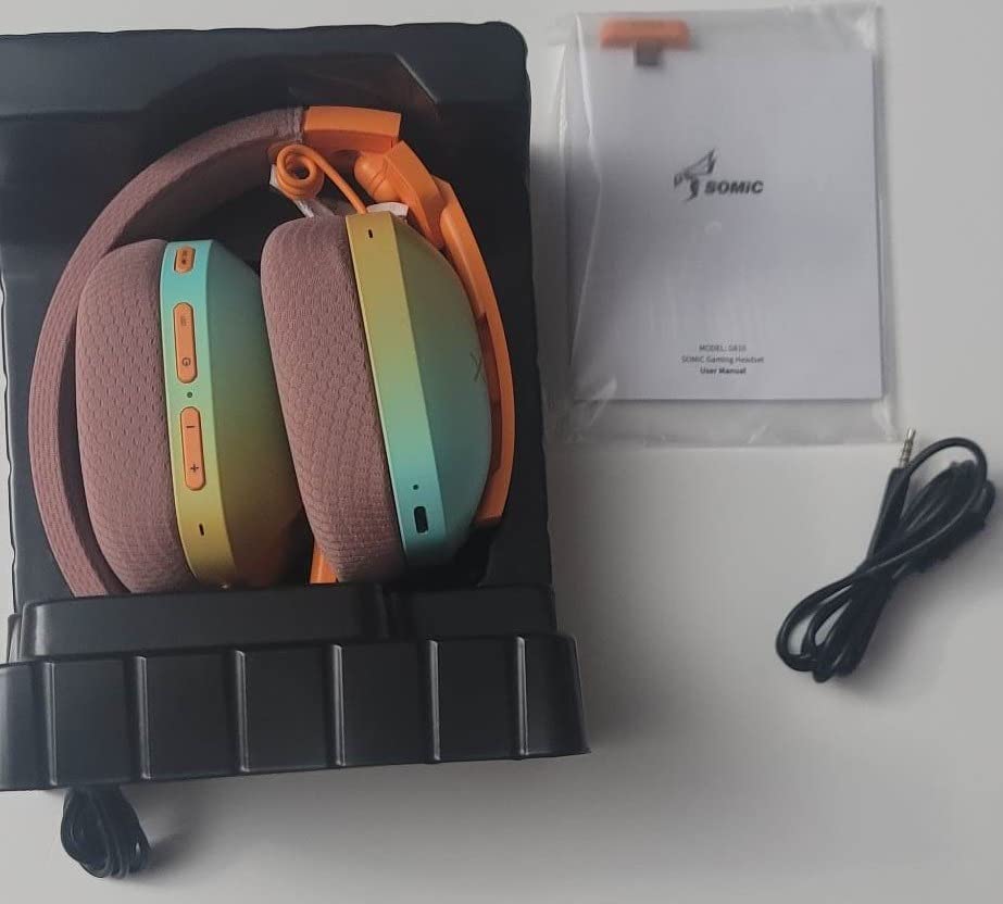 The G810 Wireless headset arrives in an eye-catching box that includes a USB-C cable, an audio cable, a Bluetooth transmitter, and a comprehensive instruction manual. The vibrant color scheme of pink, orange, and a gradient from turquoise to yellow immediately stands out. Once removed from the box, the headset requires a simple adjustment to fit comfortably around the head, thanks to its flexible and soft headband. On the right side of the headset, a convenient control panel features buttons for adjusting volume, powering on or off, controlling the LED lights, and managing the microphone and mode settings. These buttons allow for easy switching between game and music modes, toggling the microphone, and choosing between a Bluetooth transmitter connection and a mobile phone connection. The audio cable port and a Bluetooth connectivity indicator are also located here. The left side houses the USB-C charging port and a light that indicates battery status. When powered on, decorative symbols on the headset light up, cycling through multiple vibrant colors for a visually engaging effect. The headset offers flexibility in connection through standard Bluetooth or via the Bluetooth transmitter, accommodating devices without built-in Bluetooth by utilizing either a USB or USB-C connection. Designed to be lightweight and comfortable, the headset provides outstanding sound quality with a clear, immersive audio experience. It boasts a long battery life of up to 50 hours on a single charge, which takes just a few hours to complete. The combination of a comfortable fit, excellent sound quality, ease of pairing with devices, and the added enjoyment of colorful lighting effects makes this headset a highly satisfying purchase for its price.