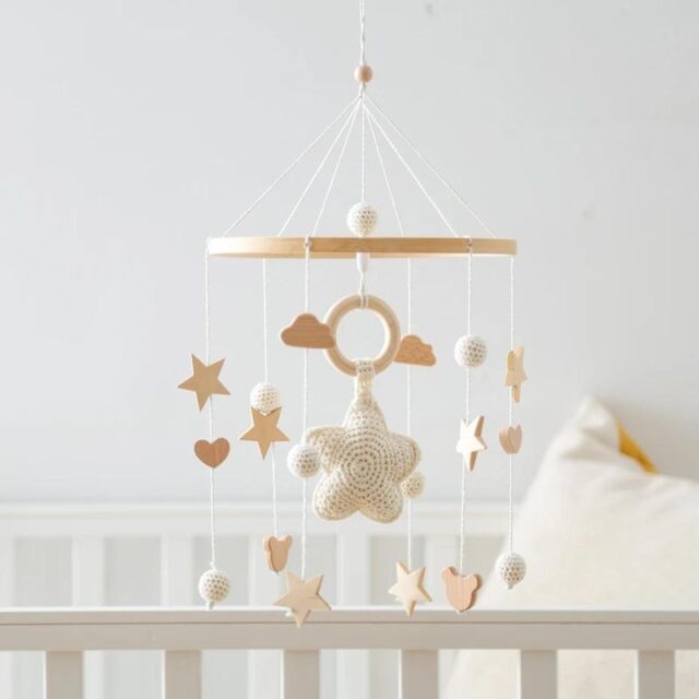 Introduce a touch of wonder to your baby’s nursery with our Wooden Crochet Stars Baby Crib Mobile with Rattle Toys. This charming mobile is designed to captivate your little one’s imagination while providing a soothing environment. Adorned with delightful crochet stars and gentle rattle toys, this mobile not only enhances the look of your baby’s crib but also supports their sensory development and comfort.
